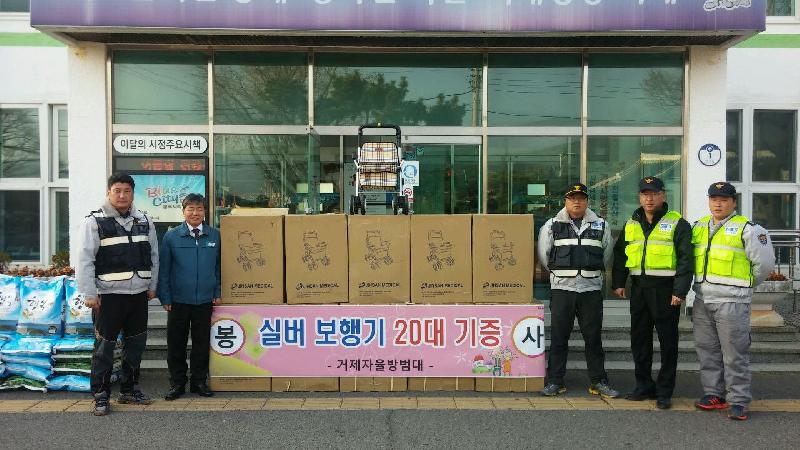 거제면자율방범대(대장 전종호)는 지난 12월 31일 관내 저소득 보행불편 어르신들을 위해 약400만원 상당의 실버카(보행보조차) 20대를 거제면사무소(면장 황이수)에 기탁했다.