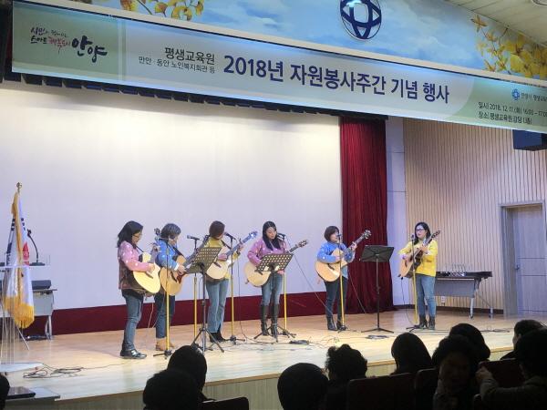 현재 안양시 평생교육과에서 지원하고 있는 평생학습 우수동아리 ‘윈드송’의 식전공연으로 기념행사의 막을 열었다. 10개의 봉사단체에 감사패를 수여하고, 평생교육 자원활동가 6명을 평생교육 유공자로 선정해 시장 표창을 전달했다. 이어 격려공연을 감상하고 자원봉사자들이 서로 감사한 마음을 나누면서 한 해를 되돌아보며 이날 행사를 마무리했다.