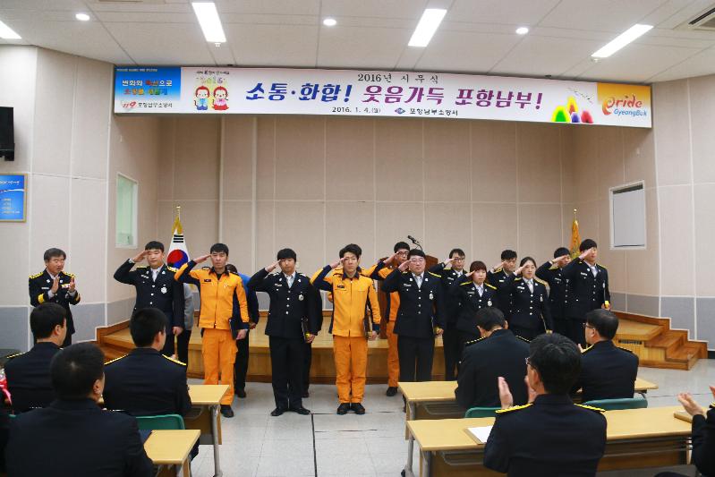 포항남부소방서(서장 김학태)는 4일 소방서 3층 대회의실에서 소방공무원, 의용소방대 및 민간인 표창대상자 등 110여명이 참석한 가운데 시무식을 갖고 2016년 새로운 출발을 다짐했다. 김학태 소방서장은 신년사에서 “지난해 직원들이 단합된 힘으로 인해 큰 재난사고 없이 한해를 보낼 수 있었다” 며 “올해도 가족과 같은 마음으로 시민에게 봉사와 헌신을 보람으로 신뢰받는 포항남부소방서가 될 수 있도록 노력해 줄 것”을 당부했다. 이날 행사에서는 30여명의 소방유공자에 대한 표창수여를 하였으며 소통과 화합을 위한 뜻으로 전직원이 함께 새해 인사와 악수를 하는 행사로 시무식 행사를 마무리 했다. 시무식 행사에 앞서 포항남부소방서에서는 간부직원들이 덕수공원 내 충혼탑을 찾아 순국선열과 호국영령 그리고 순직소방공무원을 추모하는 시간을 가지기도 하였다. // 심후보 기자 sky626201@naver.com