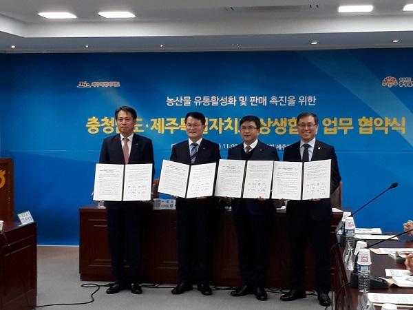 제주특별자치도와 충청남도, 농협 충남·제주지역본부는 12일 농협중앙회 제주본부에서 농산물 유통활성화 및 판매촉진을 위한 업무협약을 체결했다고 밝혔다.