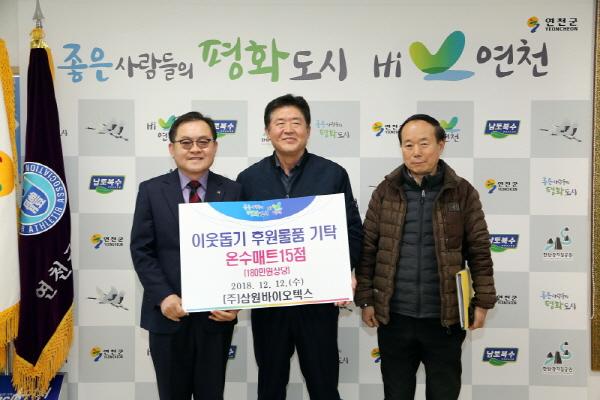 연천군 ㈜삼원바이오텍은 지난 12일 연천군을 방문해 어려운 이웃에게 전해 달라며 온수매트 15점을 기탁했다.