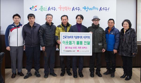 인천 서구 한국기능미화 자원봉사회 서구지회는 지난 12일 서구청장실을 방문해 이웃돕기 물품을 전달했다.