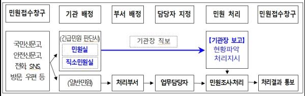 처리절차는 민원인이 긴급민원을 신고하면 민원실 또는 직소민원실에서 우선 기관장에게 직접 보고하고 기관장은 상황에 따라 처리부서에 현황파악 및 처리를 지시토록 절차를 간소화했다.