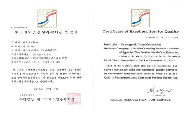 평택도시공사는 한국서비스진흥협회로부터 한국서비스품질우수기업 인증을 획득했다고 지난 10일 밝혔다.