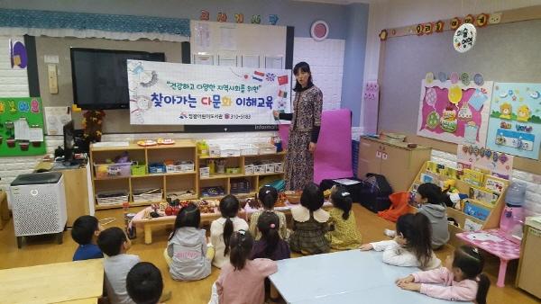 ‘찾아가는 다문화 이해교육’은 정왕동 내 유아교육기관의 신청을 받아 진행됐다. 총 50회로 운영했으며 참여인원은 1,023명이다. 중국인, 일본인으로 구성된 강사진이 다양한 소품을 활용하여 다채롭고 흥미로운 강의로 진행하여 참여기관 12개 기관 전원만족의 결과를 이끌었다.