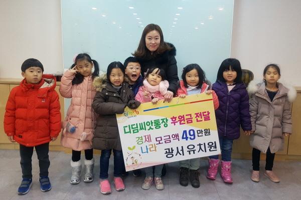 이날 광서유치원의 원아 18명이 직접 시청을 찾아와 고사리손으로 후원금을 전달했다. 후원금은 원아들이 집에서 사용하지 않는 물건과 다양한 간식거리 등을 판매한 바자회 ‘경제나라’ 행사 수익금으로 마련됐다. 전달된 후원금은 기초생활수급 아동 중 형편이 어려워 디딤씨앗통장에 지속적으로 저축을 하지 못하는 아동 7명에게 지원될 예정이다.