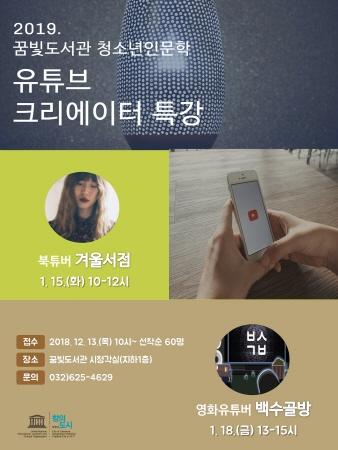 부천시립꿈빛도서관은 겨울방학을 맞이해 청소년인문학 유튜브 크리에이터 특강을 오는 1월 개최한다. ‘유튜브의 시대, 스스로 만든 일자리에서 신나게 일하는 사람들’이라는 주제로 열릴 이번 특강에서는 유튜브 채널 겨울서점, 백수골방 운영자가 강연을 맡는다.