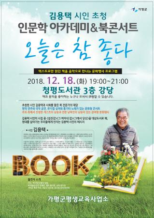 가평군이 수요조사를 통한 주민상향식 선정 프로그램인 '수요 인문학 아카데미'를 운영해 눈길을 끌고 있는 가운데 오는 18일에는 마지막 종합문화 행사인 ‘북 콘서트’가 첫 선을 보인다.