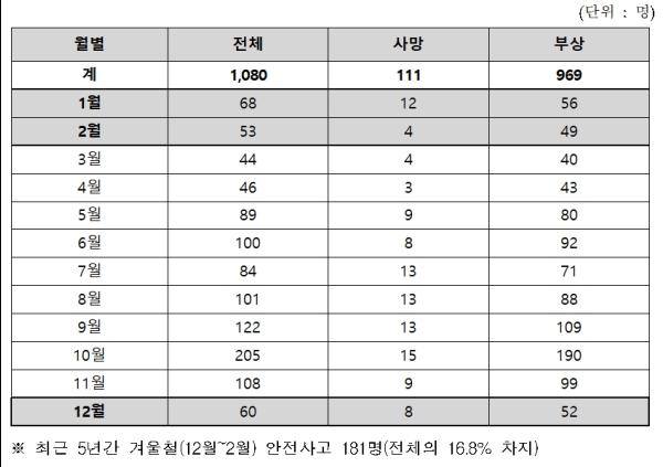 181건 중 골절은 전체의 59%인 107건을 차지했다. 다음으로는 상처가 35%인 63건, 탈진이 6%인 11건으로 나타났다. 골절과 상처를 합치면 전체의 94%로 겨울철 안전사고의 대부분이다. 5년간 사망 사고 111건 중 동사 사고는 2.7%인 3건이 발생했다.