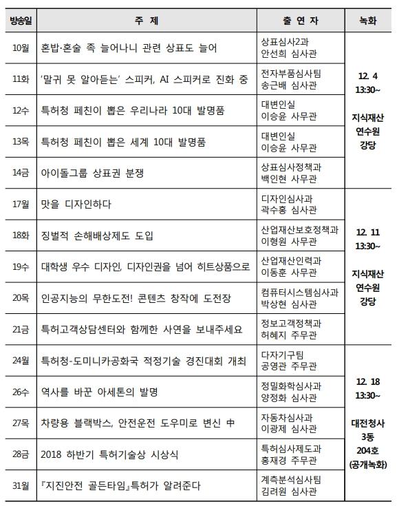 시험방송에서는 ‘혼밥·혼술족 상표출원 증가’, ‘AI 스피커’, ‘세계 10대· 우리나라 10대 발명품’, ‘아이돌상표’가 주제토크로 다루어 졌다. 시험방송 영상도 특허청 페이스북과 유튜브를 통해 시청할 수 있다.