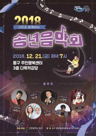 인천 동구는 오는 21일 오후 7시, 주민행복센터 3층 다목적강당에서 ‘구민과 함께하는 2018 송년음악회’를 개최한다고 밝혔다.
