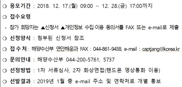해양수산부는 1차 서류심사과 2차 화상통화 면접 심사를 거쳐 최종 대상자를 선발할 예정이다.
