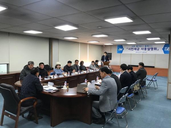 양주시시설관리공단은 지난 14일 양주문화예술회관에서 시민평가단과 함께 ‘2018년 시민 세금 사용설명회’를 개최하고, 공단의 예산 정보공개 확대 및 맞춤형 정보 제공을 위해 2018년 한 해 동안 시민의견 수렴을 통해 사용된 예산과 2019년 고객서비스품질 향상을 위해 사용될 예산 내역 보고, 각 사업별 건의사항 청취 등을 진행했다.