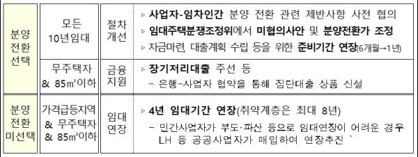 이번 대책은 높은 분양전환 가격으로 인한 자금 조달문제 등으로 분양전환이 어려운 임차인의 주거불안 해소를 위해 실질적으로 추진 가능한 지원이 필요하다는 배경에서 마련됐다.
