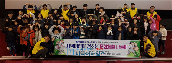 대구도시철도공사(사장 홍승활) 참사랑봉사단 문양지부는 지난 13일(목) 16시 지역사회 공헌활동의 일환으로 지역 어린이·청소년을 초청하여 영화를 관람하는 문화체험 이벤트를 진행하였다.