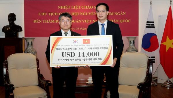 홍인성 인천 중구청장은 지난 17일 주한 베트남대사관을 방문하여 쩐 쯔엉 투이 부대사에게 나트랑시 태풍피해 복구 지원을 위한 구호성금 1만4천 달러를 전달했다.