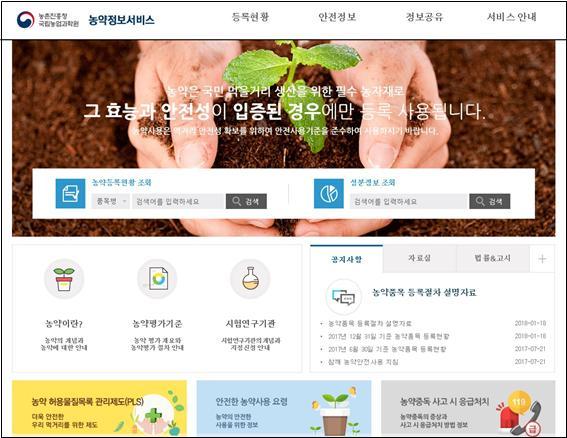 이곳에 접속하면 우리나라에 등록된 전체 농약 2,000여 품목에 대해 사용가능한 작물과 병해충·잡초, 사용적기와 방법, 10a당 사용량과 희석배수, 농약 품목의 독성정도별 독성구분 등을 검색할 수 있다.