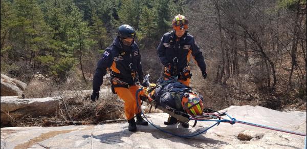 특히 눈이 많이 쌓일 수 있는 산악 지형 특성을 고려해 인명 구조 시 주로 사용하는 로프구조의 이론과 인명구조 장비 설치, 안전한 등·하강 기법, 수직·수평 구조방법, 도르래 시스템을 활용한 인명구조 등을 훈련했다.
