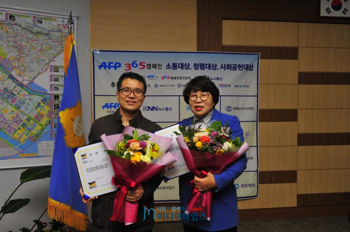 | 17일 오후, 매니페스토365캠페인 한국본부에서 주최하는 '2018년 청렴대상' 부문에서 각각 최우수상과 우수상을 수상한 김성해 의장과 김정태 의원이 수상후 기념촬영을하고 있다.(사진좌측부터- 김정태의원, 김성애 의장) |