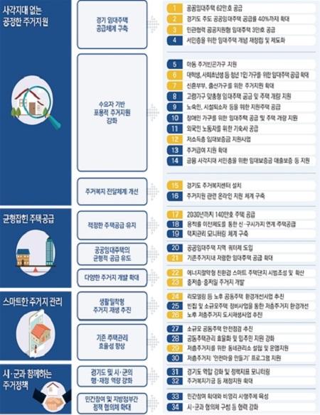 정책방향별로 구체적 내용을 살펴보면, 첫째 ‘사각지대 없는 공정한 주거지원’을 위하여 도는 공공임대주택 62만호 공급, 경기도 주도 공공임대주택 공급률 40%까지 확대 등 경기 임대주택 공급체계 구축 청년 1인가구를 위한 임대주택 공급 신혼부부·출산가구를 위한 주거지원 저소득층 임대보증금 지원 등 수요자 맞춤형 주거지원정책을 추진할 예정이다. 또, 경기도 주거복지센터를 설치해 취약계층이 소외되는 일이 없도록 주거복지 전달체계를 개선하기로 했다.