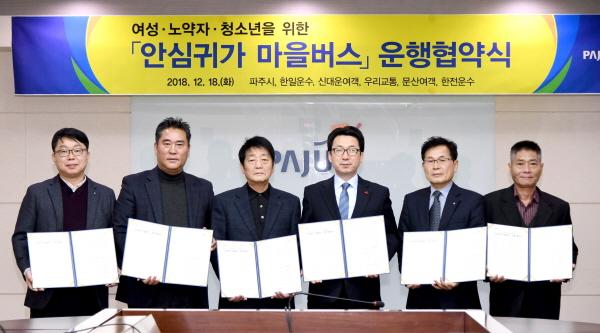 파주시는 늦은 저녁 귀갓길에 여성·노약자·청소년 등이 안전하게 귀가할 수 있도록 ‘안심귀가 마을버스’를 내년 1월 2일부터 운행하기로 하고 운수업체와 지난 18일 협약을 체결했다.