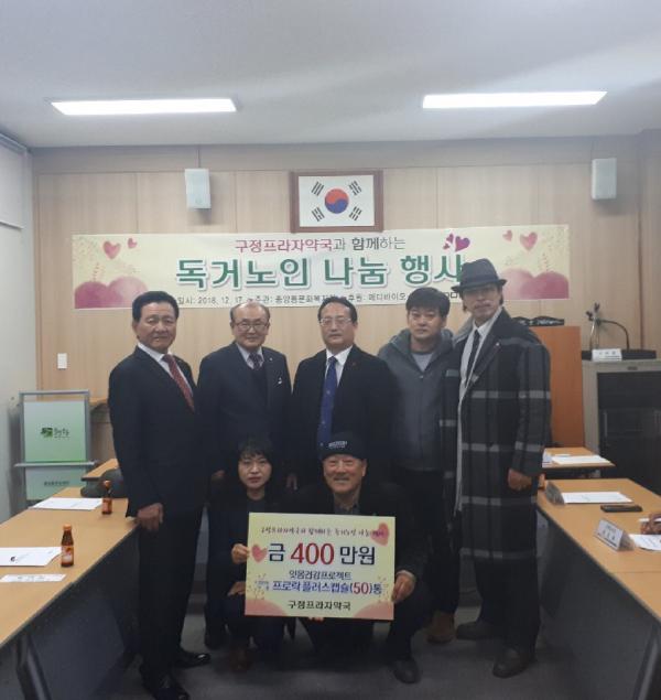 강릉 구정면에 소재하는 구정프라자약국은 중앙동 홀몸어르신들을 위해 400만원 상당의 잇몸건강개선 영양제 50통과 친환경미용비누) 50개를 중앙동주민센터에 전달했다.