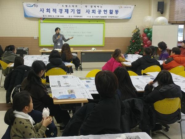 인천 동구와 동구사회적기업협의회는 지난 17일, 주민행복센터에서 드림스타트 아동과 학부모 20여명을 대상으로 ‘사회적경제기업 사회공헌활동‘을 진행했다.