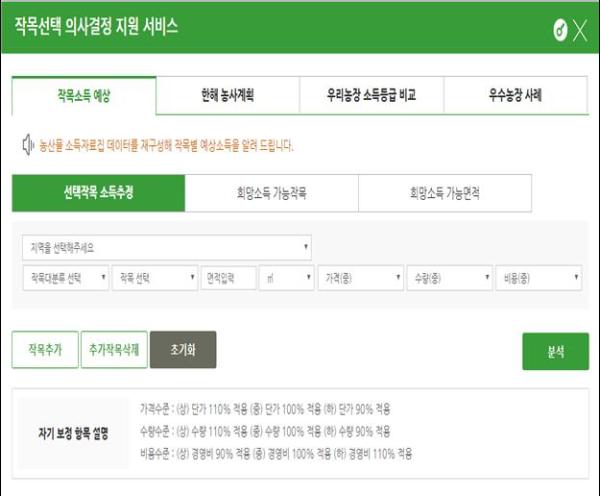농촌진흥청은 재배 작목 결정 등 중요한 의사 결정을 망설이는 농업인들을 위해 180여 가지 작목으로 얻을 수 있는 소득을 예측할 수 있는 '작목선택 의사결정 지원 프로그램'을 경기도농업기술원과 공동 개발했다.