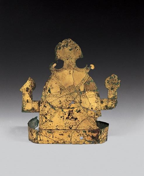 얇은 동판을 두드려 판을 만들고 그 위에 도금한 것으로, 삼국 시대의 일반적인 금동관 형태인 ‘출’자 형식에서 벗어나 중앙의 넓적한 판 위에 X자형의 문양을 점선으로 교차해 새긴 매우 독특한 양식을 보여준다.