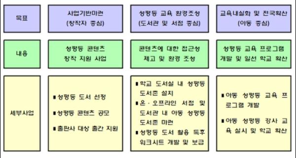 ‘성평등 도서’란 성평등을 주제로 삼거나, 성평등한 시각이 잘 담긴 도서로, 사업은 각각 ‘창작자’, ‘환경’, ‘아동’을 중심으로 3개 영역에 걸쳐 진행될 예정이다.