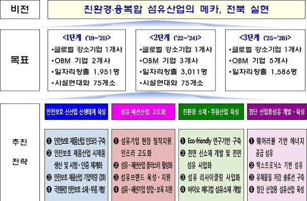 전북이 섬유산업의 새로운 성장동력 확보와 세계 최고의 섬유산업 메카로 발전될 수 있도록 2028년까지 단계별로 중점 육성할 계획으로, 섬유산업 기술 융복합 및 친환경 신소재 등의 미래 산업 육성을 위한 과제를 기획하고 공모 등 정부정책과 연계 국가 사업화, 기존 섬유산업 기반의 고도화 및 역량강화 등 침체된 도내 섬유산업의 경쟁력 강화와 재도약을 위해 추진하겠다는 것이다.
