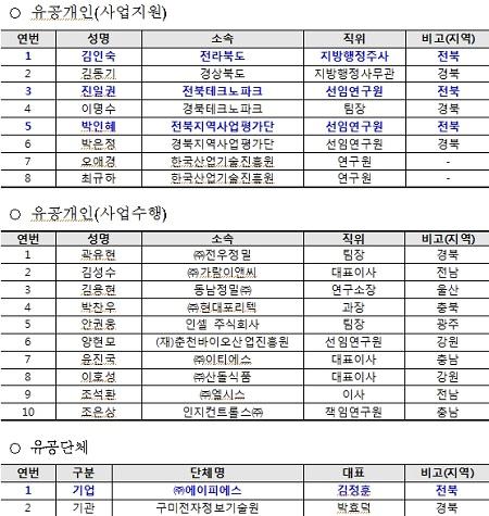 유공자로 수상한 전북도 미래산업과 김인숙 주무관, 전북TP 진일권 연구원, 지역사업평가단 박인혜 연구원은 3년 넘게 지역산업의 기획부터 사업수행, 평가관리 등의 업무를 수행하면서 지역산업 및 지역기업 육성에 기여하였으며, 우수기업으로 선정된 ㈜에이피에스 또한 수출 107백만원, 신규 일자리 10명을 고용하는 등 지역경제 활성화에 기여했다.