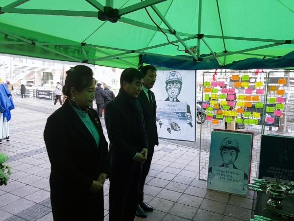 경기도의회 더불어민주당 대표단은 19일 수원역 남측광장에 마련된 태안화력 비정규직 청년 노동자 故 김용균씨의 분향소를 찾아 조문했다.