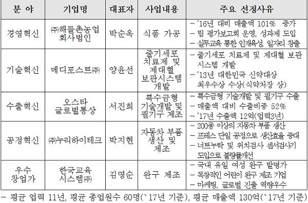 올해 선정된 우수여성기업은 2017년 기준 평균 업력 11년, 평균 매출액 130억원, 평균 종업원수 60명인 기업들로, 경영혁신 분야 ㈜해들촌농업회사법인, 기술혁신분야 메디포스트㈜, 수출혁신분야 오스타글로벌통상, 공정혁신분야 ㈜누리하이테크, 우수창업가 한국교육시스템㈜이다.