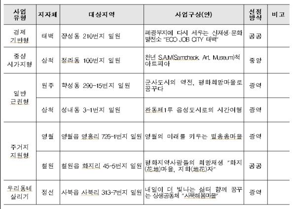 한편, 8월에 선정된 강원도 7곳의 도시재생뉴딜사업이 오늘 특위에서 선도지역으로 지정되었으며 실현가능성 및 타당성평가 등을 거쳐 ’19년 상반기에 착공될 예정이다.
