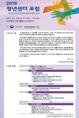 고용노동부과 한국고용정보원은 19일 오전 11시 서울 중구 충정로역 LW컨벤션 그랜드볼룸에서 "2018 청년센터 포럼" 을 개최한다.