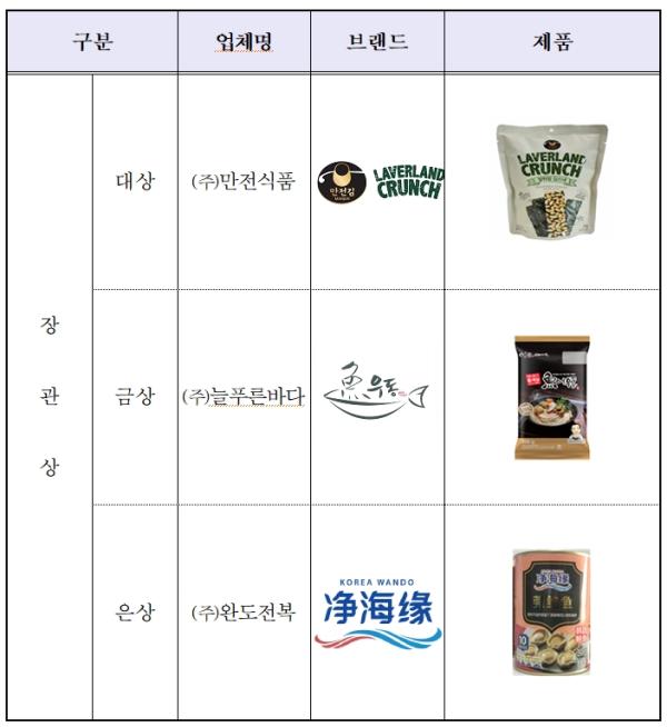 해양수산부장관 표창은 수산물 수출 확대에 공헌한 수출업체 ㈜대광에프엔씨, ㈜신안천사김, ㈜경남무역, 재원글로벌넷, 휴먼웰, ㈜솔뫼에프엔씨, ㈜삼해상사, ㈜씨포스트 등 8개사와 수출지원기관인 수협중앙회, 한국수산회 등 2개 기관의 관계자가 받게 된다.