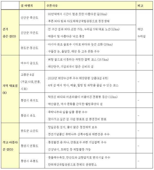 ‘10선’에는 해안누리길 노선이 있는 3개의 섬과 함께, 겨울철 상대적으로 따뜻한 전라남도와 경상남도의 섬 7개가 포함되어 있다.