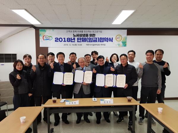파주시시설관리공단과 직장노동조합은 지난 19일 파주스타디움 회의실에서 임직원 및 조합 임원이 참석한 가운데 2018년 단체협약을 체결했다.