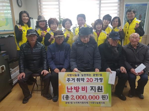 광명시 광명7동 누리복지협의체는 지난 19일 관내 동절기 주거 취약계층인 노인 20가구에 총 200만 원의 난방비를 지원했다. 이번 난방비 지원으로 수혜자들은 겨울철 혹한으로 인한 동파를 방지하고 감염성 질환을 예방할 수 있게 됐다.