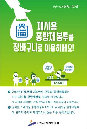 재사용 종량제봉투는 마트, 편의점 등에서 1회용 비닐봉투 대신에 물건을 담는 장바구니 용도로 사용한 후 다시 쓰레기를 배출할 수 있는 종량제봉투로, 시는 가정에서 주로 사용하는 다양한 규격의 일반용 및 음식물용 종량제봉투를 모두 재사용 종량제봉투 형태로 제작해 판매할 예정이다. 재사용 종량제봉투는 양 옆에 안으로 접힌 부분이 있어 크기는 작아 보이지만 용량은 같은 규격의 기존봉투와 동일하며, 기존에 구매한 종량제봉투도 계속 사용이 가능하다.