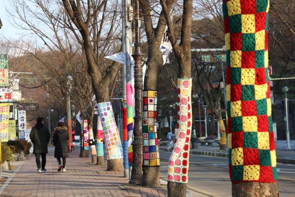지난 10월 27일 모습을 드러낸 이곳 털실 옷 가로수 길은 크리스마스와 연말연시를 앞두고 가로수길 옆 벽천광장을 수놓은 성탄트리와 조화를 이뤄, 특히 밤에도 오색빛깔의 아름다움은 식을 줄을 모른다.