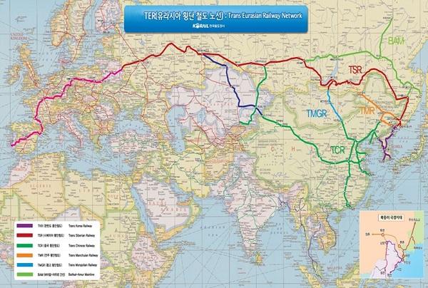 한편, 유라시아 노선은 한반도 종단철도, 시베리아 횡단철도, 중국횡단철도 등을 통해 한반도에서 유럽까지 이어지는 철도노선으로 이 철의 실크로드가 완성되면 한국의 물류가 세계 3대 경제축 중 ‘유럽연합과 동북아’의 2개 경제축이 직접 연결되는 것이다.