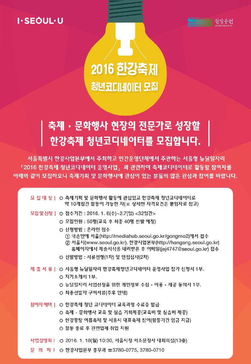 2016년 한강축제 청년코디네이터’ 참여자 모집과 관련한 자세한 사항은 한강사업본부 총무과(3780-0775)로 하면 된다.