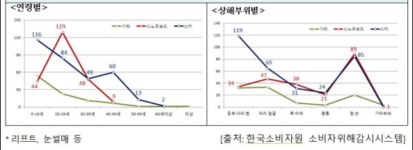 상해 발생 부위는 스키가 둔부·다리·발에서 119건으로 가장 많았고, 스노우보드는 팔과 손을 가장 많이 다쳤다.
