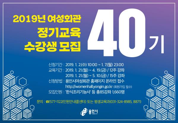 용인시 여성회관은 내년 1월 21일부터 4월 19일까지 3개월 과정으로 운영하는 제 40기 정기교육의 수강생 1,660명을 내년 1월 2일부터 7일까지 모집한다.