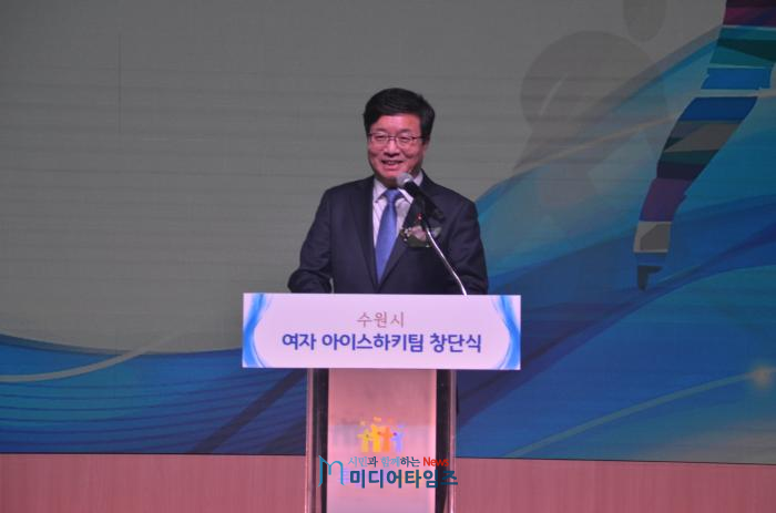 | 20일 오후, 염태영 수원시장이 ‘수원시청 여자아이스하키팀 창단식’에서 창단사를 하고 있다. |