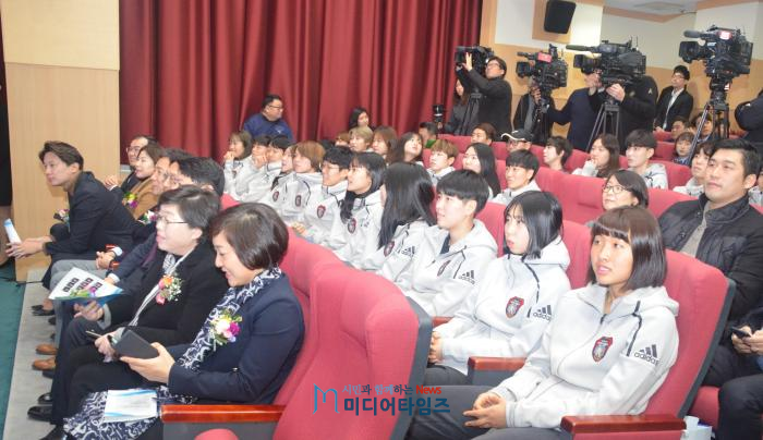 도종환 장관은 “평창동계올림픽은 평화올림픽의 상징이 됐고, 그 과정에서 여자아이스하키 남북단일팀이 한 역할은 크다”면서 “여자아이스하키 국가대표 선수들의 소망이었던 실업팀을 창단한 수원시에 감사드린다”고 말했다.