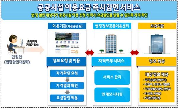 즉시 감면서비스는, 보건복지부, 국가보훈처 등 여러 기관에 흩어져 있는 본인의 감면자격 정보를 본인이 원할 때에 공공시설 운영기관이 즉시 확인할 수 있도록 한다.