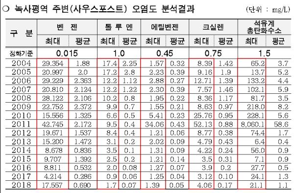 서울시는 2018년도 용산미군기지 주변 지하수 관측정 62개소에 대한 오염도 검사결과 27개 관측정에서 지하수 정화기준을 초과했고, 벤젠은 최대 1,170배를 초과하였으며, 자유상유류가 지속적으로 검출됐다고 밝혔다.